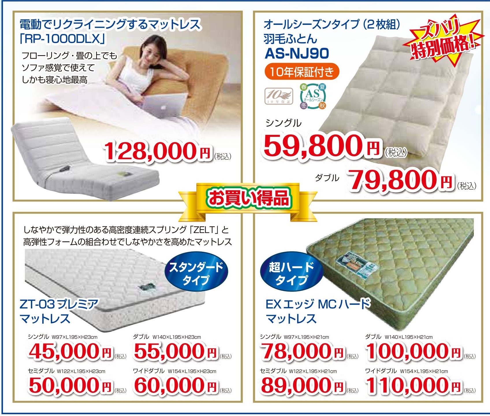 ベッド、シングルベッド、セミダブルベッド、ダブルベッド、ワイドダブルベッド、クイーンベッド、各サイズマットレス、各サイズ、ベッドフレーム,羽毛フトン、ソファー、センターテーブル、リクライニングチェアー、